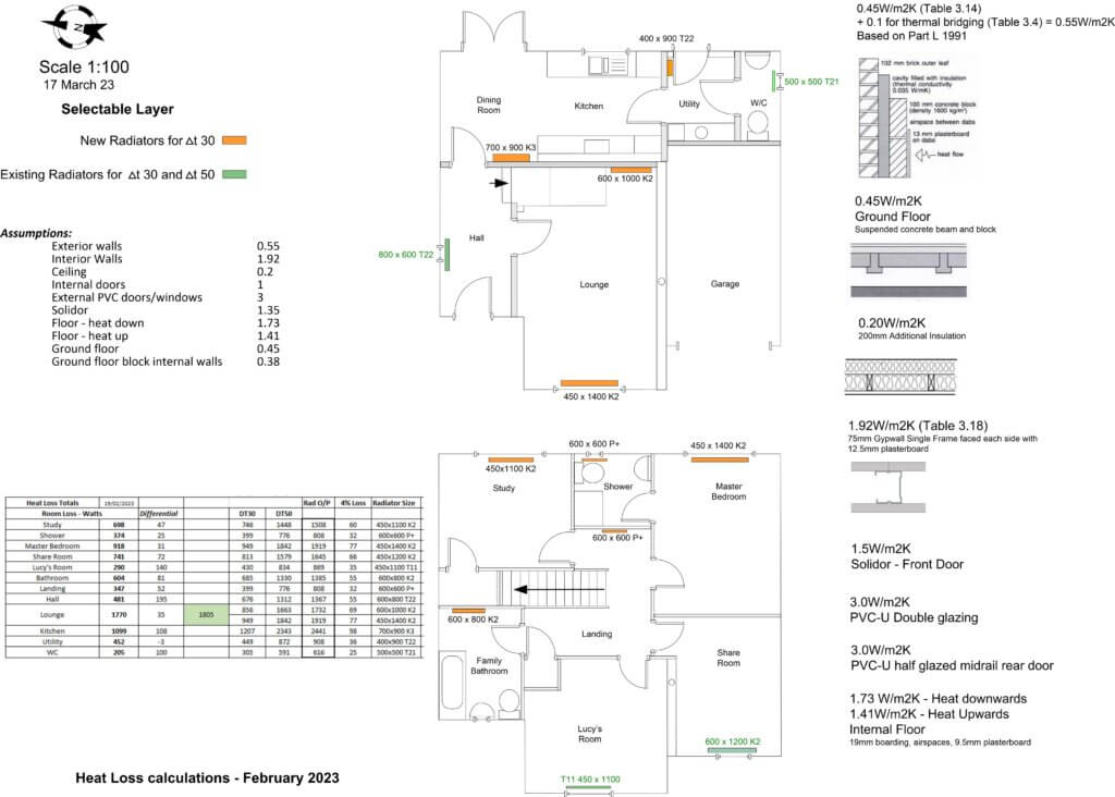 The Heat Loss calculations linked earlier, determined that a total of 9 radiators would needed upsizing to meet the heat losses at the lower radiator flow temperatures of DT30 to keep the boiler in the condensing range as much as possible.