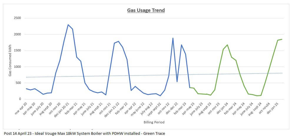 6 May 23 – On going historic Gas kW usage graph in order to monitor the new boilers performance, new boiler installed part way through the period apr-apr 23.